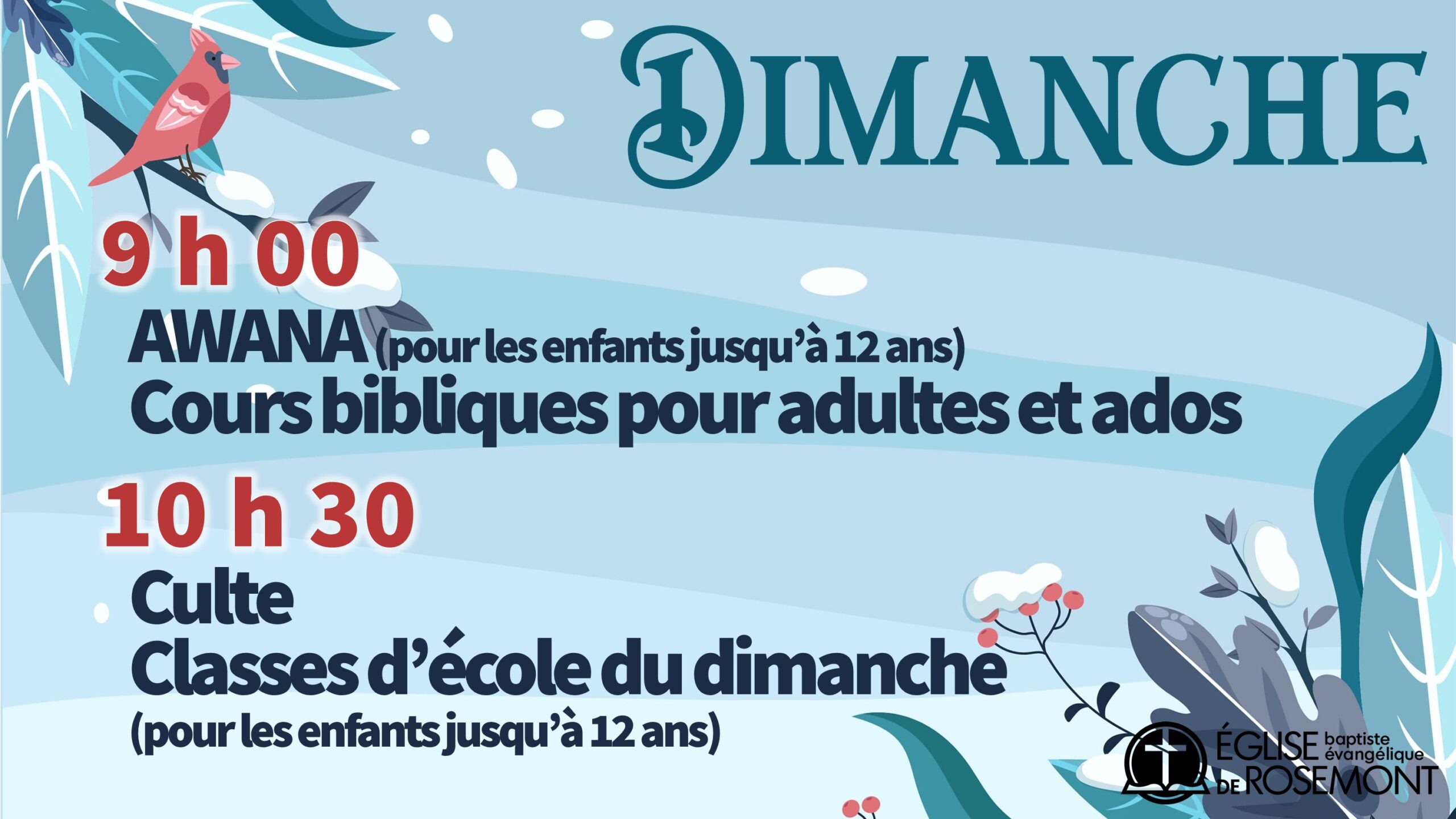 Les dimanches à 9 h, des cours sont offerts aux adultes et aux jeunes. Dès le 11 janvier, les cours suivants seront donnés :